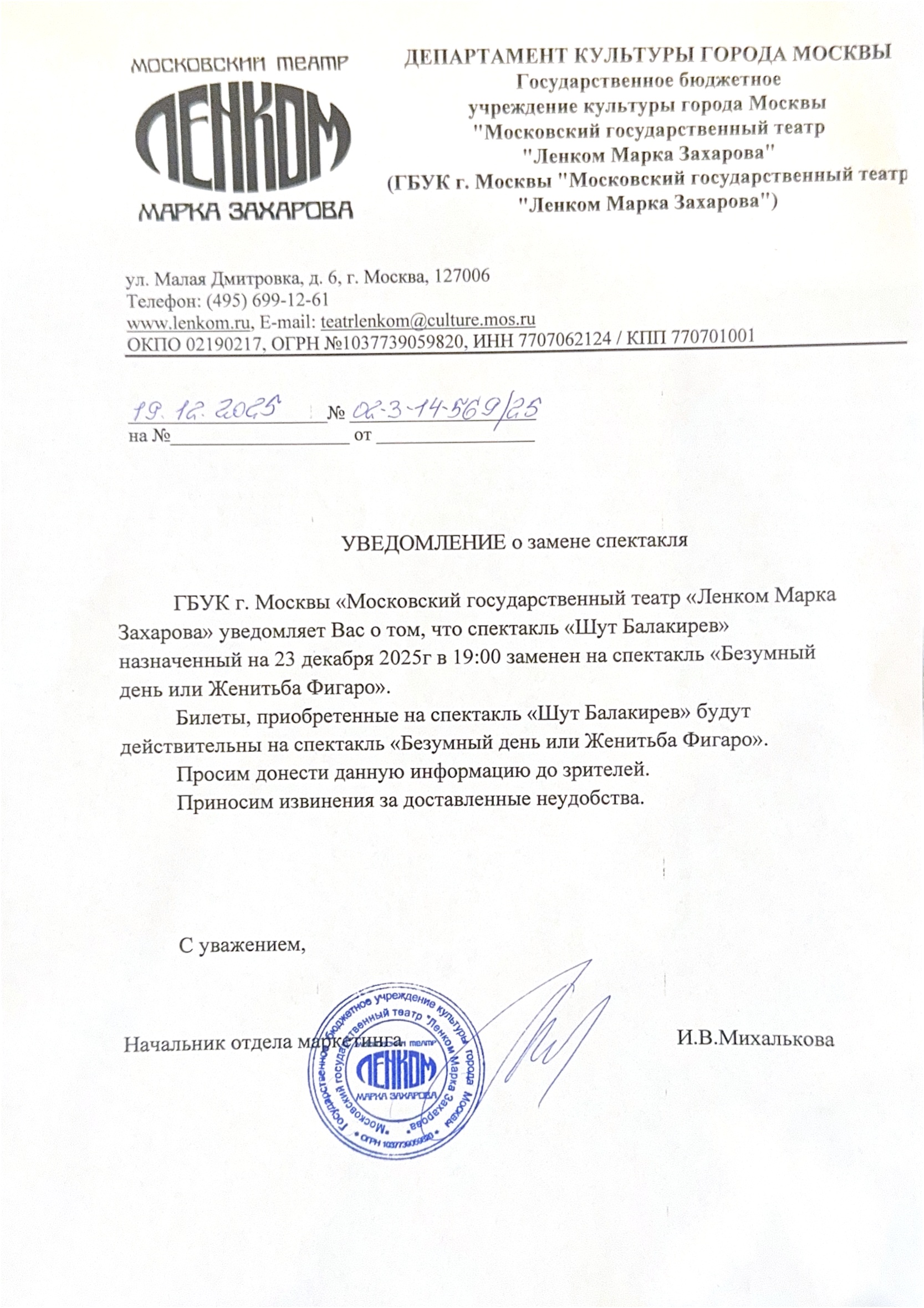 Уважаемый клиент! Спешим сообщить, что по информации, полученной от организатора, спектакль «Шут Балакирев», запланированный на 23 декабря 2025 года в 19:00 в театре «Ленком», заменён на спектакль «Безумный день или женитьба Фигаро». Ранее приобретенные билеты действительны, обменивать их не нужно. Если вам не удобно посетить мероприятие, вы можете вернуть билет по кнопке в личном кабинете во вкладке «Заказы». Деньги за электронные билеты вернутся автоматически в полном объёме на карту, с которой была произведена оплата. Если вы купили билет в кассе Ticketland.ru за наличный расчет, то обратитесь, пожалуйста, на почту: vozvrat@ticketland.ru. Письмо от организатораС уважением, команда поддержки Ticketland