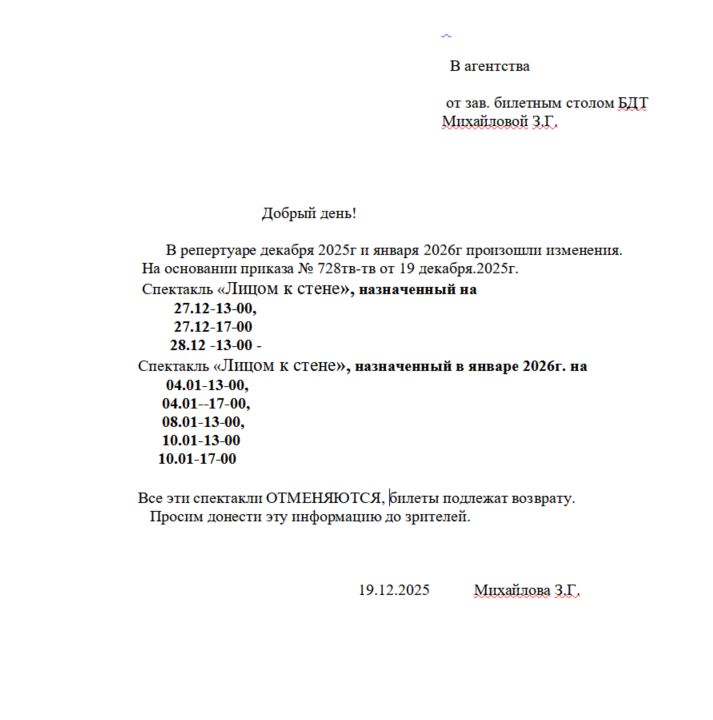 Уважаемый клиент! Спешим сообщить, что по информации, полученной от организатора, спектакль «Лицом к стене», запланированный на 27 декабря 2025 года в 13:00 и 17:00, на 28 декабря 2025 года в 13:00, на 4 января 2026 года в 13:00 и 17:00, на 8 января 2026 года в 13:00, на 10 января 2026 года в 13:00 и 17:00 в БДТ имени Г. А. Товстоногова, отменен. Деньги за электронные билеты вернутся автоматически в полном объёме на карту, с которой была произведена оплата. Если вы купили билет в кассе Ticketland.ru за наличный расчет, то обратитесь, пожалуйста, на почту: vozvrat@ticketland.ru. С уважением, команда поддержки Ticketland.