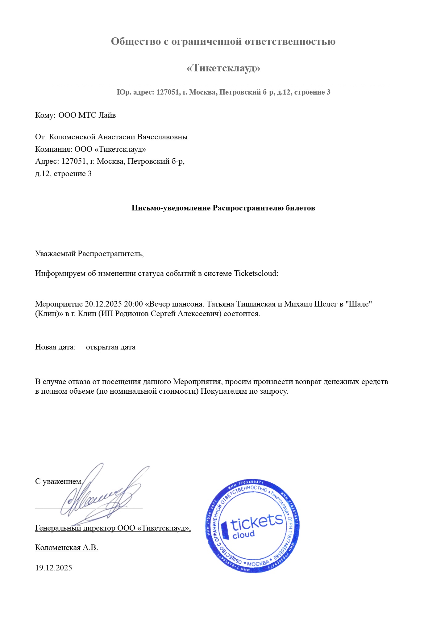 Уважаемый клиент! Спешим сообщить, что по информации, полученной от организатора, шоу «Музыкальное лото со стендап-комиком», запланированное на 19 декабря 2025 года в 21:30 в Одесса-мама, отменёно. Организатор предлагает посетить концерт Музлото на следующей неделе. Для того, чтобы подтвердить перенос, нужно связаться с организатором и подтвердить свое присутствие способом звонка или сообщения тел. +7 (926) 851-85-89. тг - @standupmoskvich. Это очень важно, потому что мест может не быть тех, которые изначально приобретались. Возможно места будут отличаться по цене, поэтому разница в стоимости будет возвращена на карту.Без подтверждения организатор не гарантирует наличие свободных мест. Если условия вас не устраивают, вы можете вернуть билет по кнопке в личном кабинете во вкладке «Заказы». Деньги за электронные билеты вернутся автоматически в полном объёме на карту, с которой была произведена оплата. Если вы купили билет в кассе Ticketland.ru за наличный расчет, то обратитесь, пожалуйста, на почту: vozvrat@ticketland.ru. С уважением, команда поддержки Ticketland.